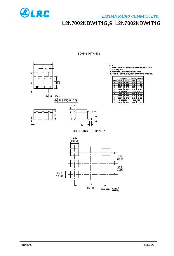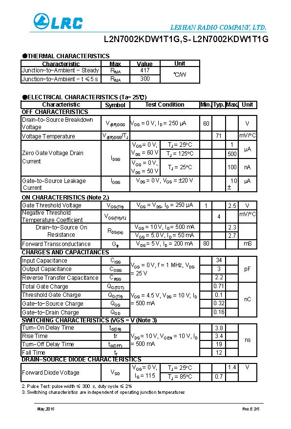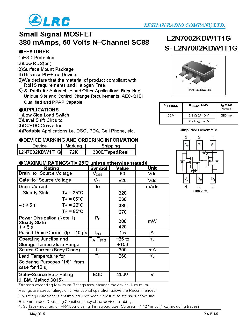 L2N7002KDW1T1G SC-88 60V Dual-N-Channel(with ESD) LRC MOS管