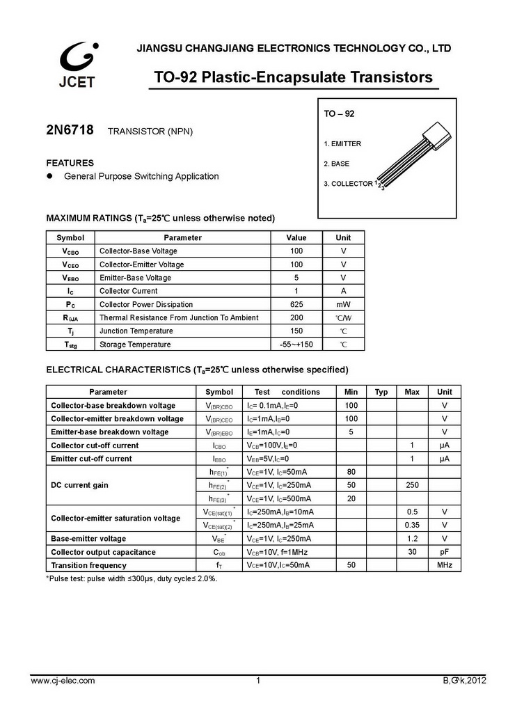 2N6718 NPN 625mW IC=1000mA BVCBO=100V TO-92 長電 開關晶體管