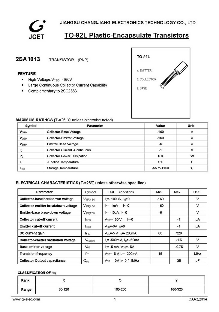 2SA1013 PNP 900mW IC=1000mA BVCBO=160V TO-92L 長(zhǎng)電 開關(guān)放大晶體管